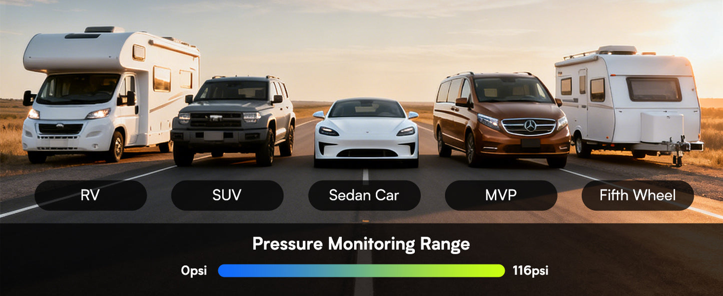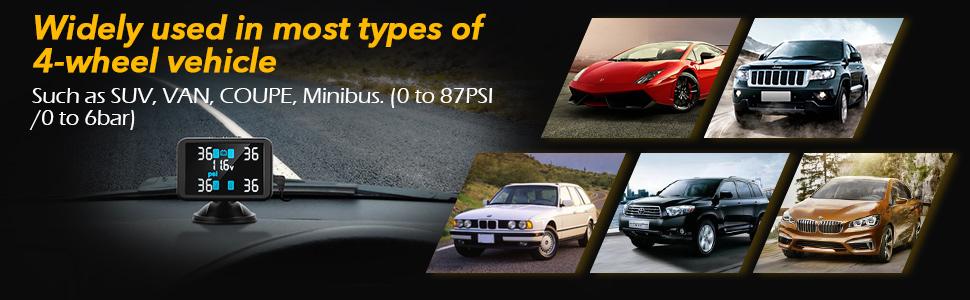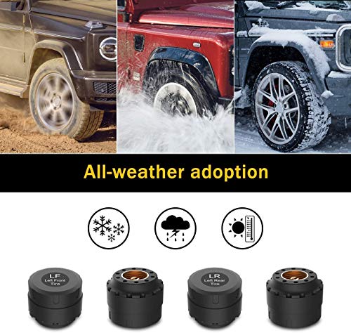 Details: WIDE ANGLE LCD SCREEN: 3. 7inch LCD Screen displays real-time pressure, car voltage and temperature. Pressure unit is BAR/PSI, and temperature unit is ℃/℉. It has Bright backlist and Clear readings, you can easily read the data. Multiple ALARM Modes: Tymate wireless TPMS include fast leak alarm, slow leak alarm, high pressure alarm, high temperature alarm, sensor fault alarm and sensor battery low power alarm, keeping your driving safe. External Sensors: Comes with 4 external sensors and sealed against dust, water and snow, easy installation and receive real-time signal. Tire pressure sensor is only 9 grams and the battery life can last up to 2 years, the battery (CR1632) can be replaced when the battery exhausted. Widely Use: Tymate TPMS can be widely used in most types of 4-wheel vehicle, Sedan car, Off road vehicle, SUV, Commercial Car, Station Wagon, Minibus, Limousine, MPV, Sports Car, Pickup Truck and more. NOT SUITABLE for Trailer or RV. Dynamically Monitor: Dynamically monitors real time air pressure and temperature on the screen, Improve fuel efficiency, prolong tire life and ensure drive safety. Universal Fit Type