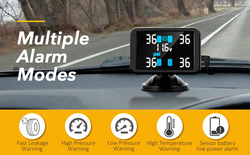 - 🚙Four Types of Alarms and User-Set Alarm Values : Tymate Tire Pressure Monitoring System TM527 equipped with four-alarm modes (high pressure, low pressure, high temperature, and rapid air leakage alarm), promptly reporting the abnormal tire condition to the driver to help safe driving. Drivers can set the maximum and minimum alarm values for tire pressure and temperature. (Set unit: axle. TP setting range: 12-87 PSI) (Two units for choose - Bar/PSI & ℃/℉).