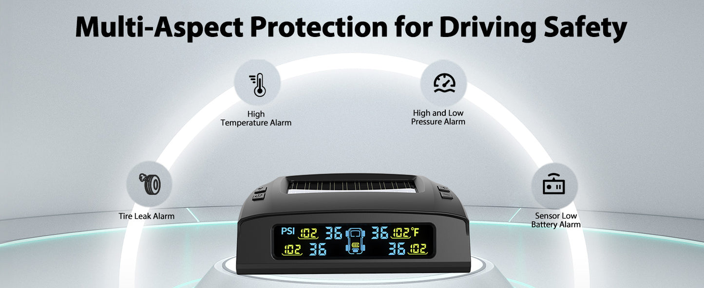 - 🚗Five alert modes: Real-time monitoring of tire pressure, temperature, and sensor battery level. Supports rapid deflation, high/low pressure, high temperature, and low voltage alerts with customizable thresholds.