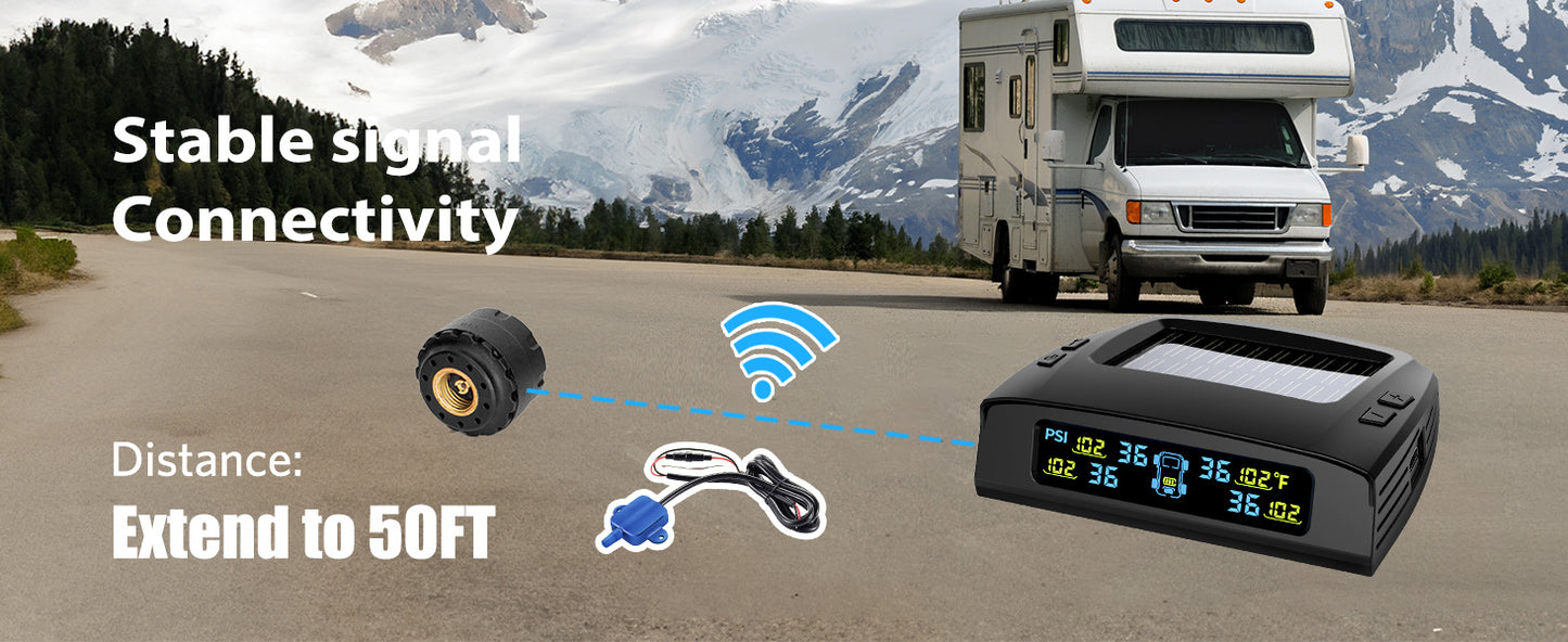 - 🚗High-precision sensors: Error margin ≤3 PSI, battery life up to 2 years. Dustproof, waterproof, and snow-resistant with easy installation. With a range exceeding 50 feet when paired with a repeater.