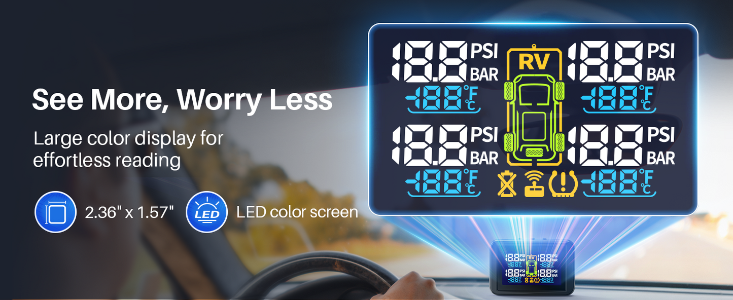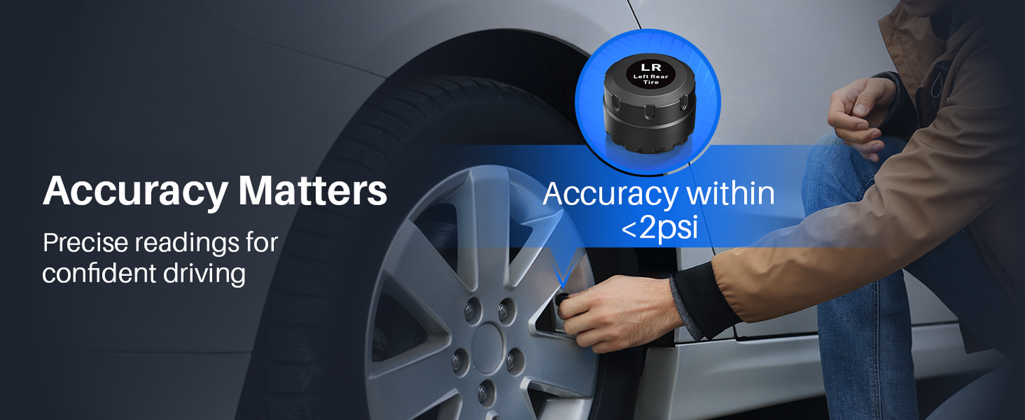 - Long-Lasting & Accurate Sensors:Four energy-efficient external sensors offer reliable, long-term use. Compact, easy to install, and highly accurate (±3 PSI error). Built tough for all driving conditions.