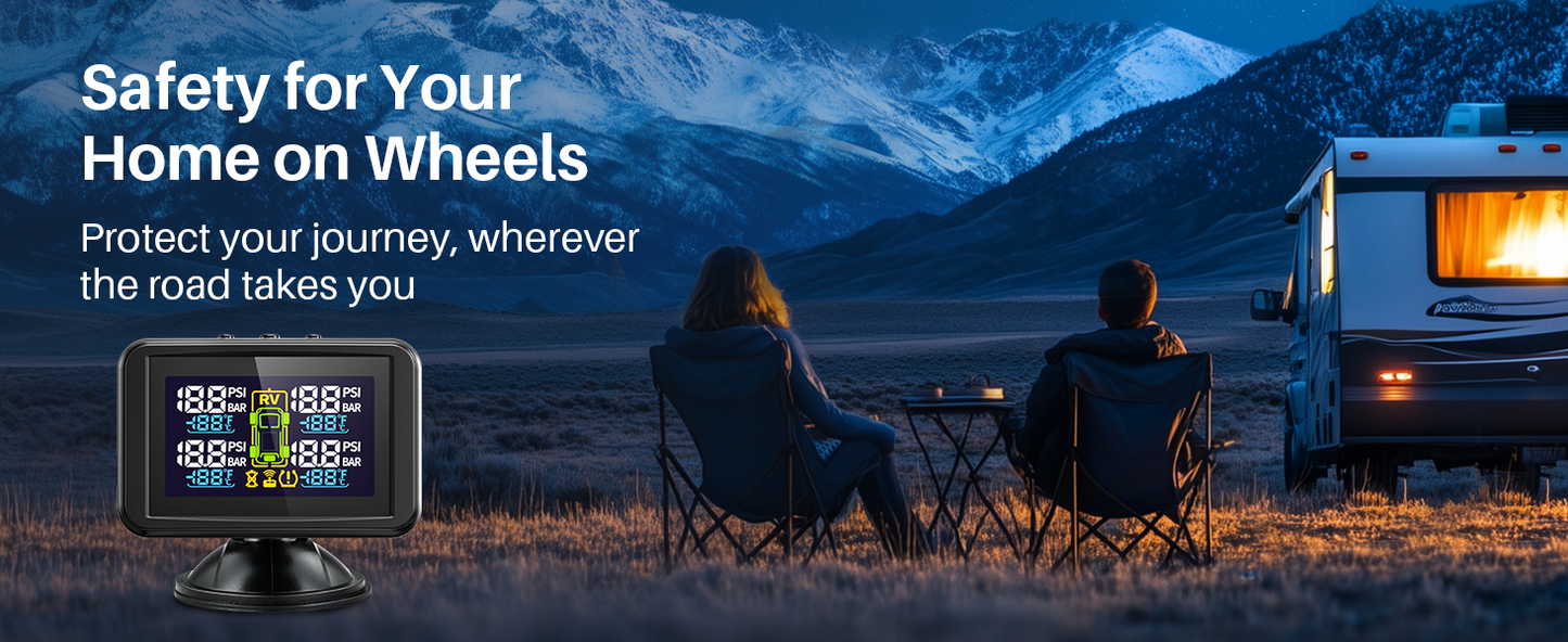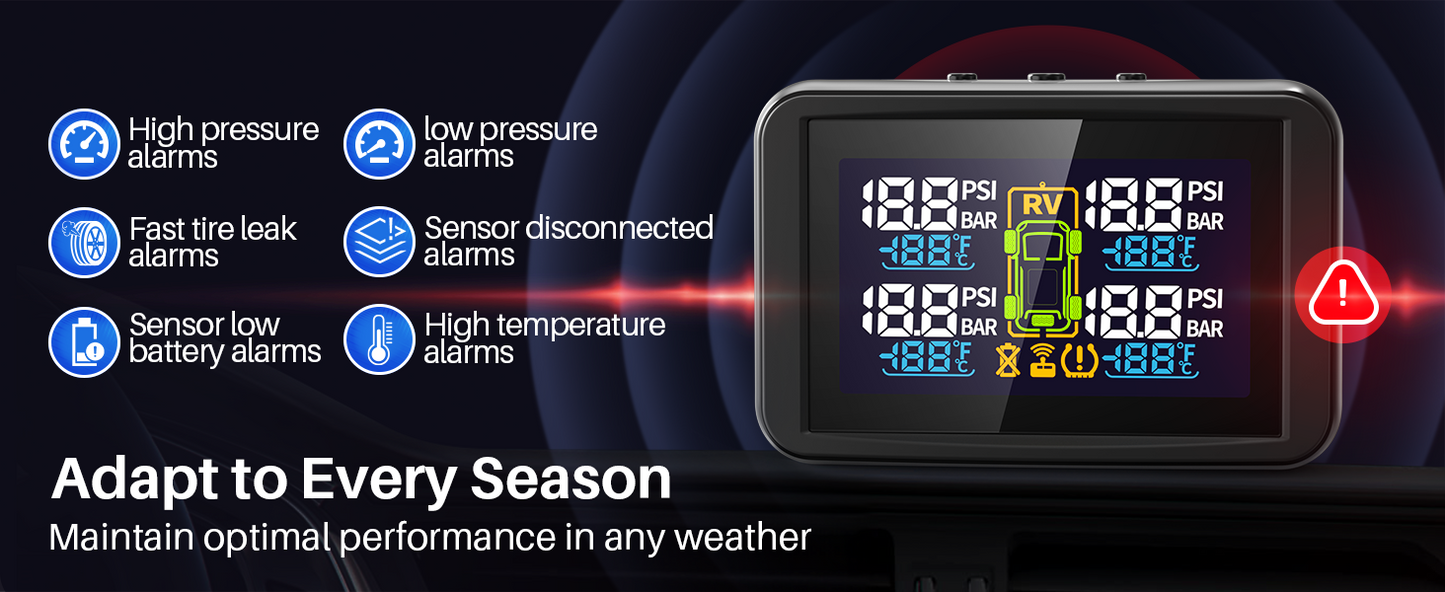 - Easy Setup & Support:Pre-paired sensors for plug-and-play installation. Turn on the monitor first, then install sensors—data appears within 5–10 minutes of driving. Alarm thresholds auto-set based on initial pressure.